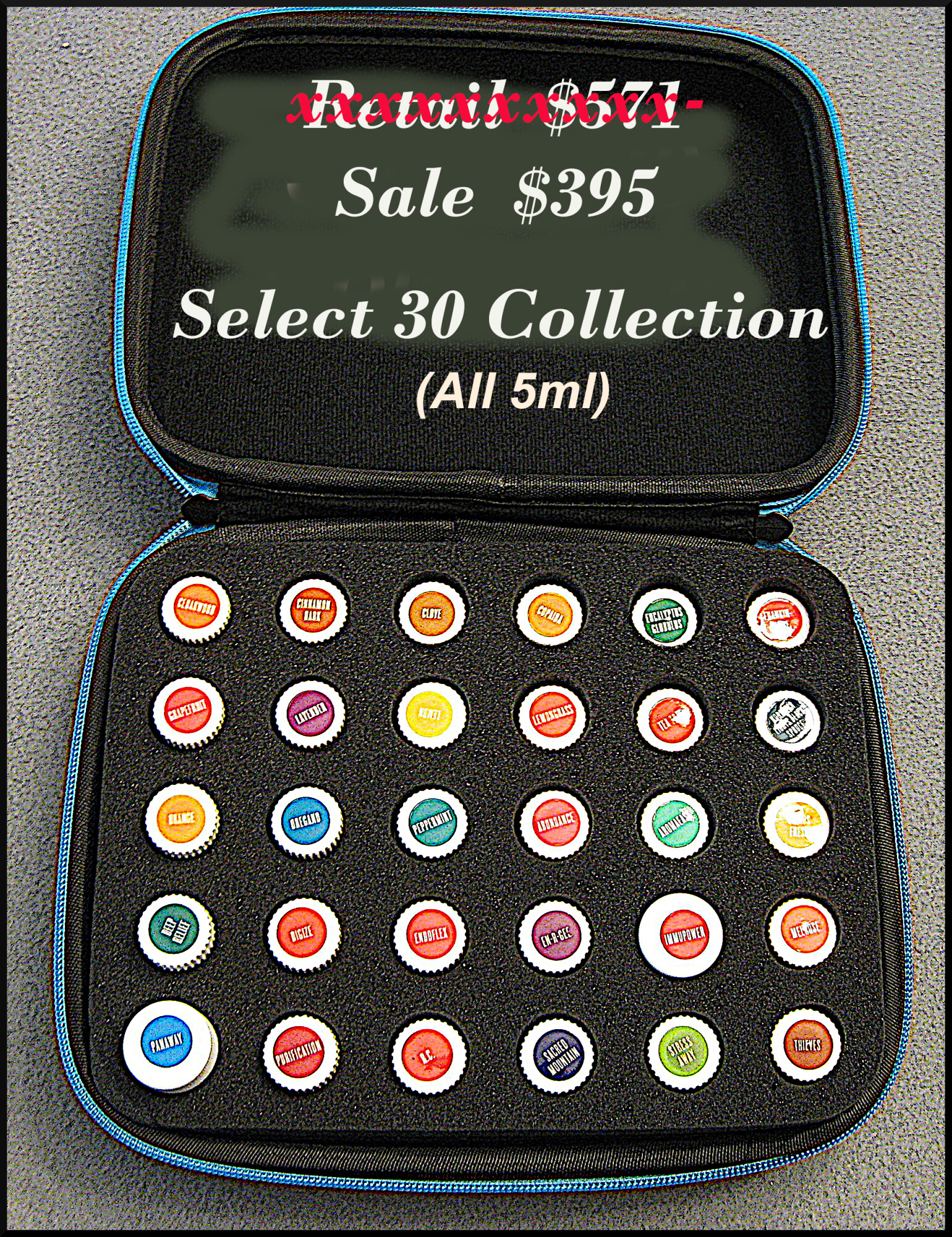 Holds 30 5/15ml bottles. Pocket for another 12 15ml oils or rollers. Additional zippered area for paperwork.